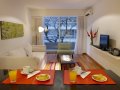 Elegantes móveis criam uma atmosfera perfeita neste apartamento situado no 2º andar. A sala possui um sofá branco, televisor com tela LCD e uma mesa de centro, tudo isso com uma generosa vista à sacada e às árvores da rua. A cozinha possui uma mesada com duas banquetas perfeitas para refeições rápidas. O quarto principal possui uma cama de casal king size, uma grande janela e muito espaço no guarda-roupa. Todo o conjunto cria um ambiente perfeito para o hospedar um viajante.